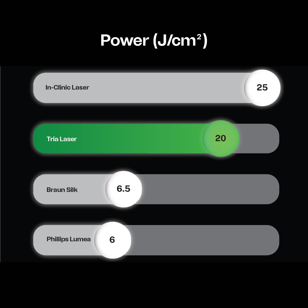 The Tria 4X Hair Removal Laser produces 20 J/cm² of power per pulse, which is over 3X more power than the 6 J/cm² released by the Braun IPL Silk-Experts Pro. Our Tria 4X Hair Removal Laser is the highest power that is safe for at-home use, delivering clinic-grade performance.