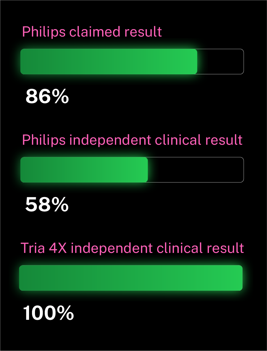 Philips offers users a great solution for hair reduction, saving them money versus going to a clinic. However, Tria offers clinical-grade results from the comfort of your home, clinically proven to deliver up to 100% hair removal**, making it the best solution for at-home hair removal.