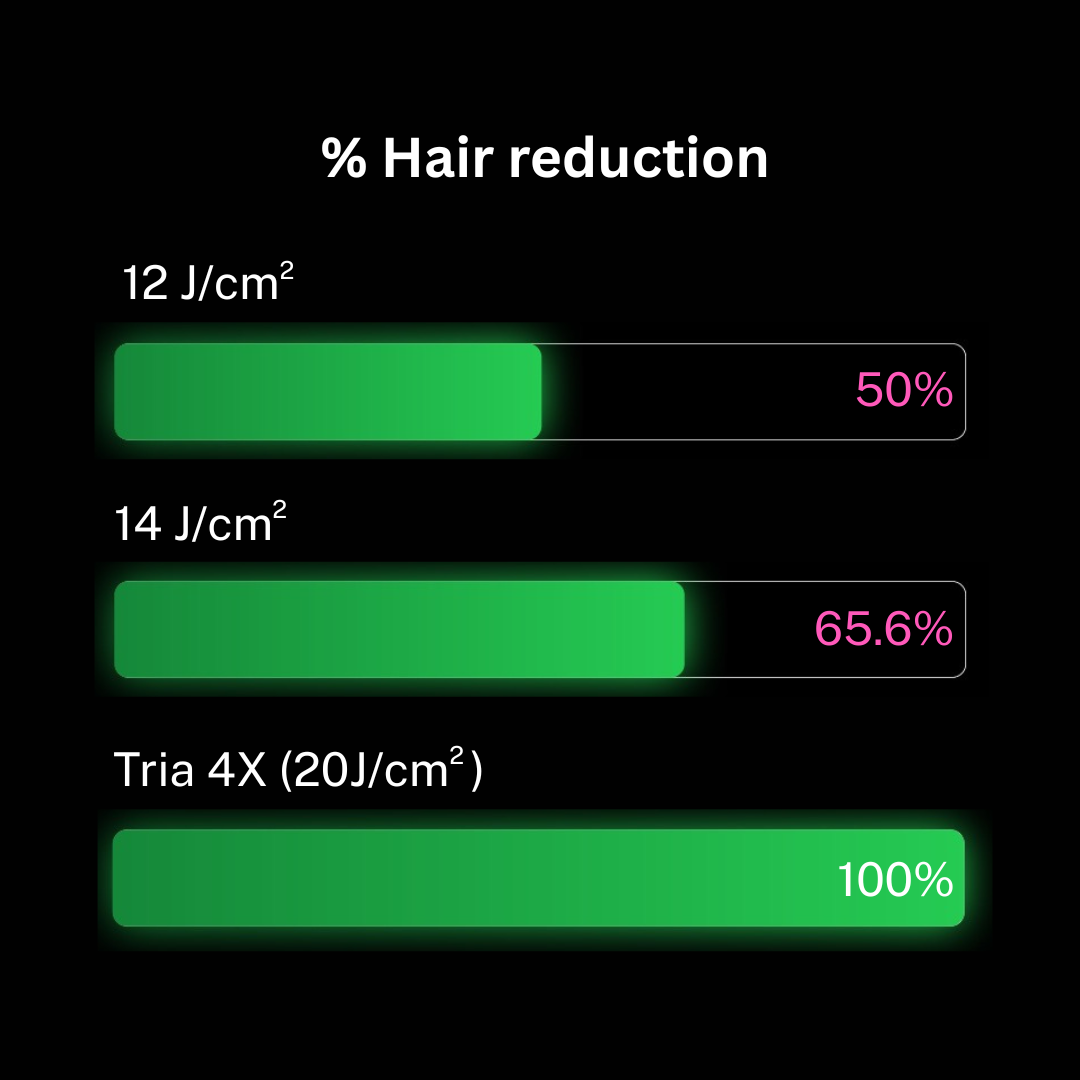 - Tria 4X is 20 J/cm² with users experiencing up to 100% hair reduction.**